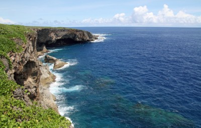사이판 북동부에 작은 석회암섬. 섬에 뚫린 구멍들은 새들이 사는 집으로 자연스럽게 형성되었다.