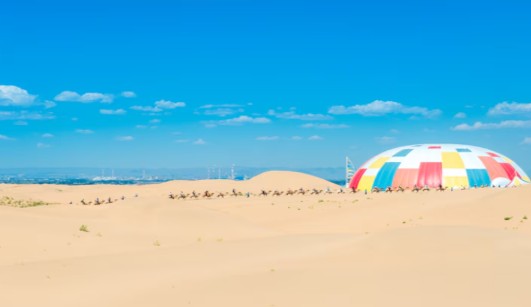 인컨타라 사막: 사막 생태 문화와 초원 문화가 융합된 국가 4A급 사막 관광지구 입니다. 인컨타라 사막의 모래 언덕은 지속적으로 분포되어 있으며 모래 언덕의 높이는 110m입니다. 모래 언덕의 모래는 꼭대기에서 미끄러져 내려오며 울리는 소리를 내기때문에 "노래하는 사막"이라 불리웁니다.